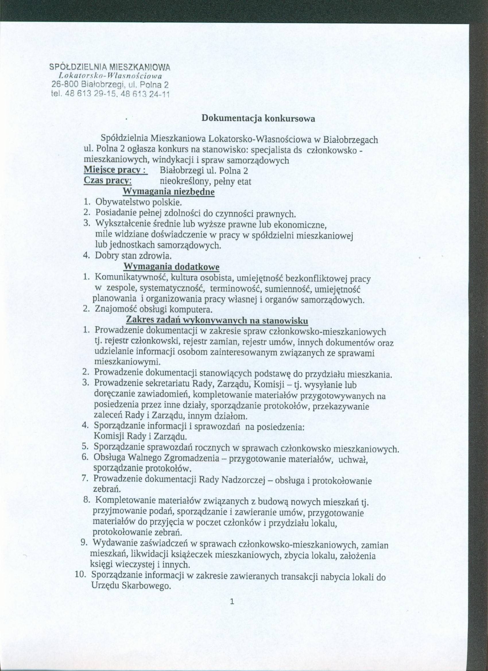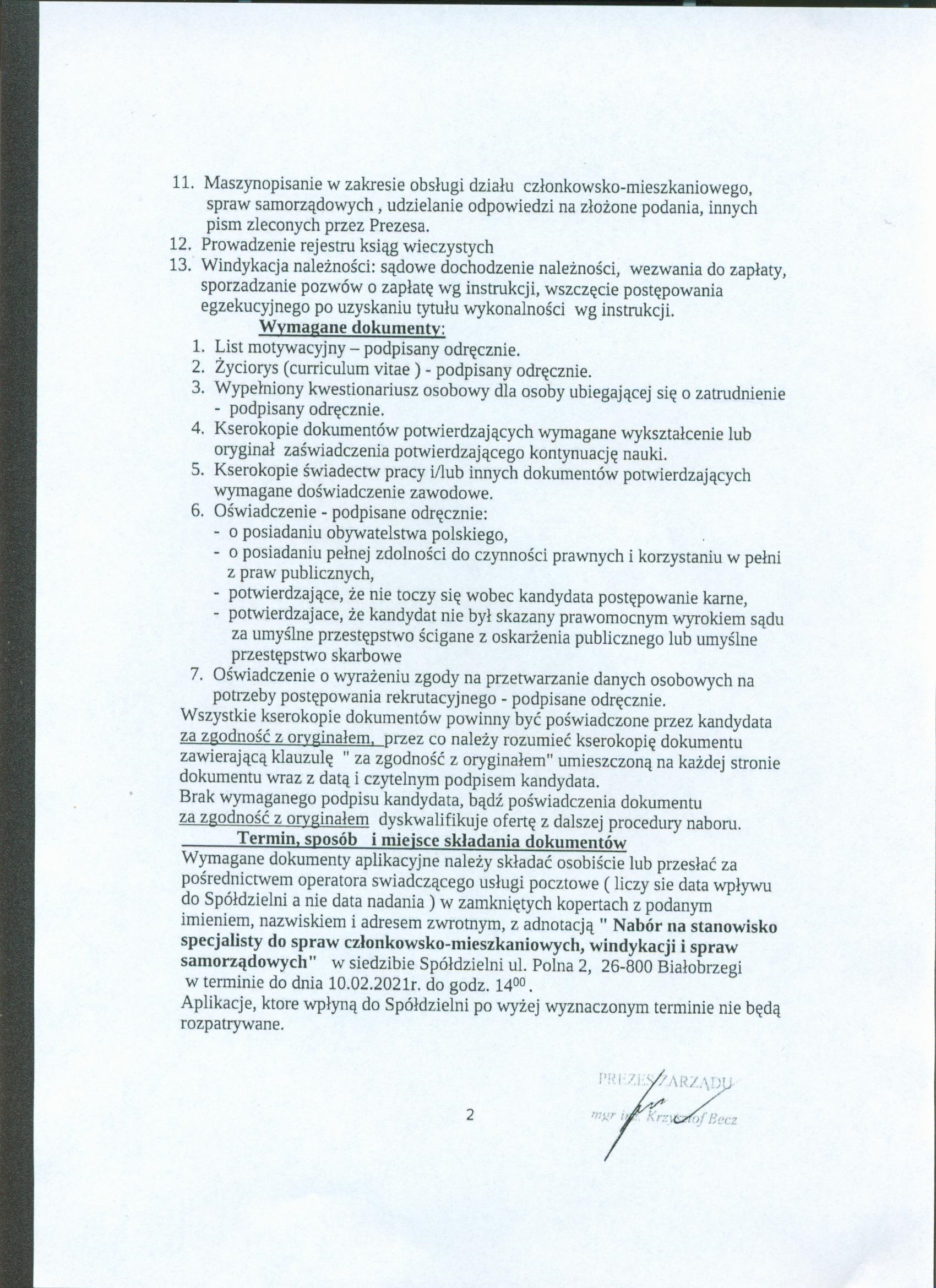 specjalista ds członkowsko-mieszkaniowych, windykacji i spraw samorządowych.