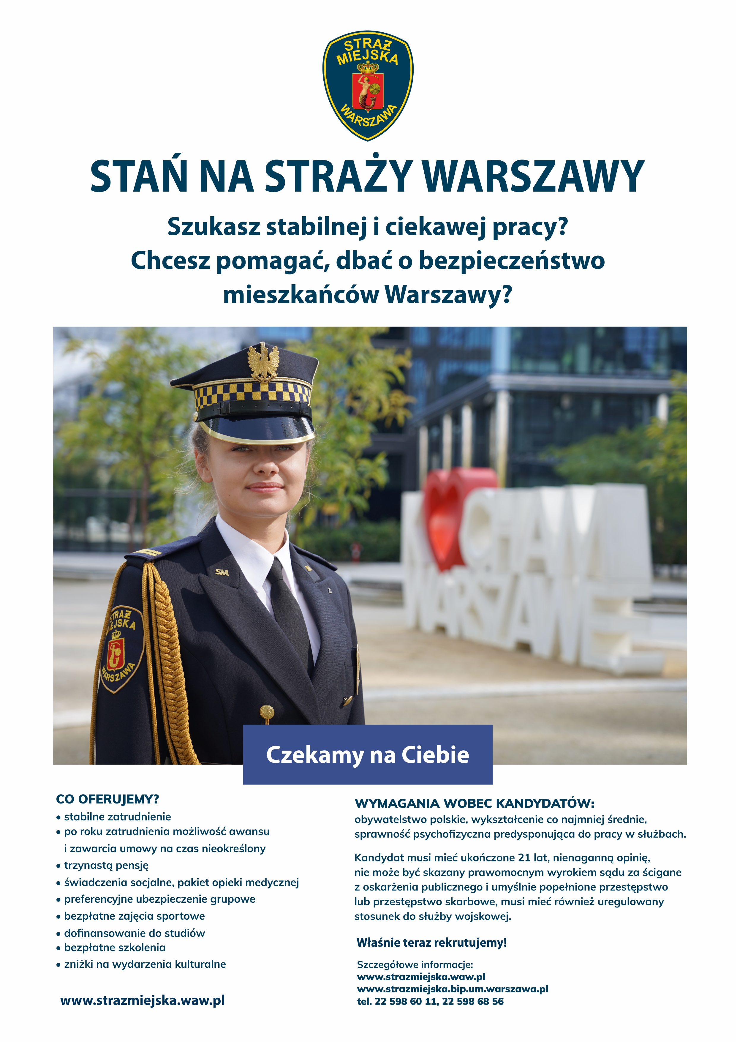 W załączeniu  plakat informujący o naborze do Straży Miejskiej m.st. Warszawy.