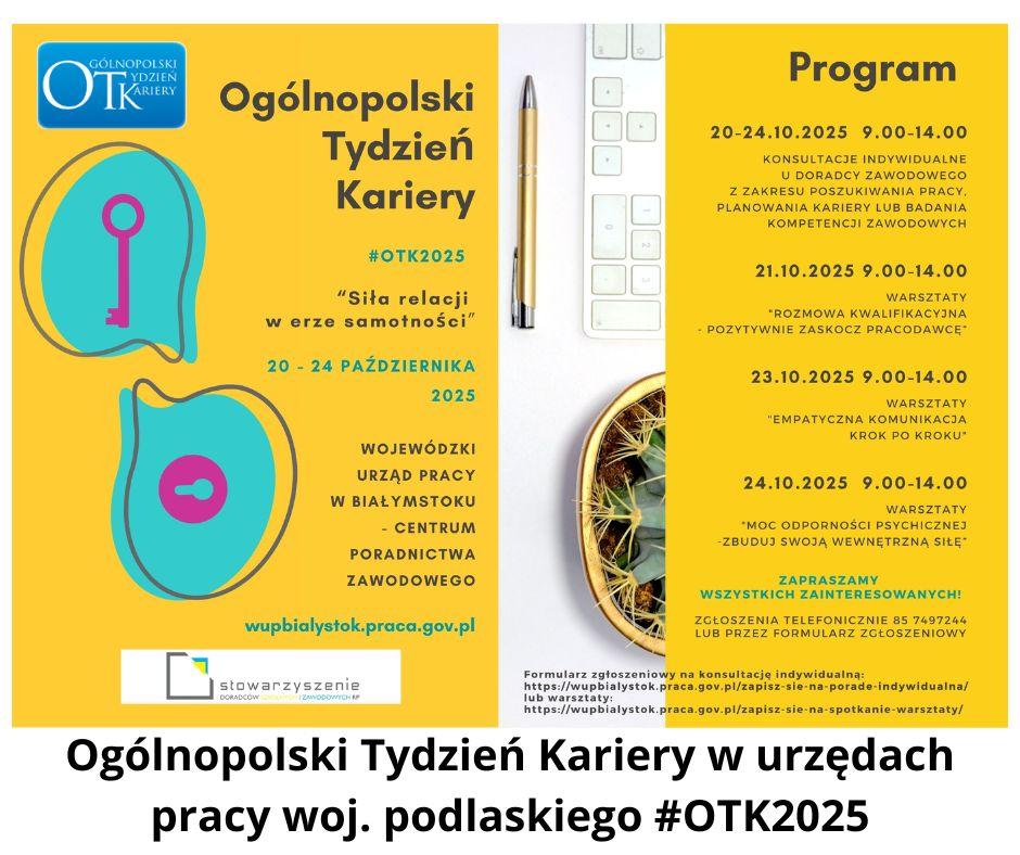 Od 20 do 24 października 2025 r. obchodzony był XVII Ogólnopolski Tydzień Kariery (OTK). Tegoroczna edycja odbyła się pod hasłem: „Siła relacji w erze samotności" Wojewódzki Urząd Pracy w Białymstoku wraz z Powiatowymi Urzędami Pracy województwa podlaskiego co roku przyłączył się do tej inicjatywy, celem promowania działań doradców zawodowych na rzecz planowania i budowania ścieżek karier oraz wzmacniania motywacji i odkrywania talentów, tak bardzo potrzebnych na rynku pracy.